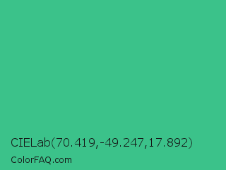 CIELab 70.419,-49.247,17.892 Color is a normal green color and the nearest color is Mint #3eb489. Hex code #3bc28a and RGB value is rgb(59,194,138). In RGB color space, this color is composed of 23% red, 76% green, 54% blue, In CMYK color space, this color is composed of 70% cyan, 0% magenta, 29% yellow , 24% black , In HSL color space, this color has a hue angle of 155° , 53% saturation and 50% lightness.