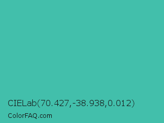 CIELab 70.427,-38.938,0.012 Color is a normal cyan color and the nearest color is Puerto Rico #3fc1aa. Hex code #42bfab and RGB value is rgb(66,191,171). In RGB color space, this color is composed of 26% red, 75% green, 67% blue, In CMYK color space, this color is composed of 65% cyan, 0% magenta, 10% yellow , 25% black , In HSL color space, this color has a hue angle of 170° , 49% saturation and 50% lightness.