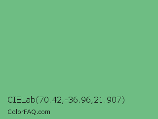 CIELab 70.42,-36.96,21.907 Color is a normal green color and the nearest color is Iguana Green #71bc78. Hex code #6ebd83 and RGB value is rgb(110,189,131). In RGB color space, this color is composed of 43% red, 74% green, 51% blue, In CMYK color space, this color is composed of 42% cyan, 0% magenta, 31% yellow , 26% black , In HSL color space, this color has a hue angle of 136° , 37% saturation and 59% lightness.