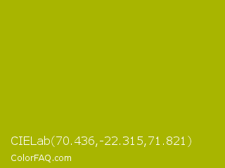 CIELab 70.436,-22.315,71.821 Color is a normal yellow color and the nearest color is Pistachio Green #9dc209. Hex code #a8b500 and RGB value is rgb(168,181,0). In RGB color space, this color is composed of 66% red, 71% green, 0% blue, In CMYK color space, this color is composed of 7% cyan, 0% magenta, 100% yellow , 29% black , In HSL color space, this color has a hue angle of 64° , 100% saturation and 35% lightness.