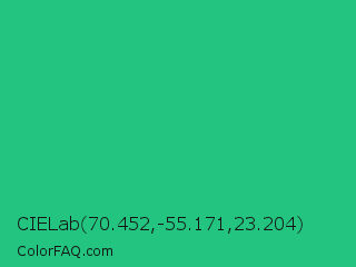 CIELab 70.452,-55.171,23.204 Color is a normal green color and the nearest color is Mountain Meadow Crayola #1ab385. Hex code #23c480 and RGB value is rgb(35,196,128). In RGB color space, this color is composed of 14% red, 77% green, 50% blue, In CMYK color space, this color is composed of 82% cyan, 0% magenta, 35% yellow , 23% black , In HSL color space, this color has a hue angle of 155° , 70% saturation and 45% lightness.