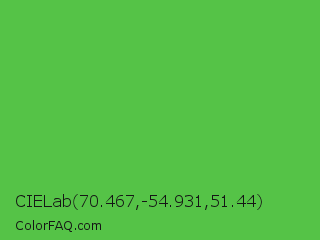 CIELab 70.467,-54.931,51.44 Color is a normal green color and the nearest color is Apple #4fa83d. Hex code #55c347 and RGB value is rgb(85,195,71). In RGB color space, this color is composed of 33% red, 76% green, 28% blue, In CMYK color space, this color is composed of 56% cyan, 0% magenta, 64% yellow , 24% black , In HSL color space, this color has a hue angle of 113° , 51% saturation and 52% lightness.