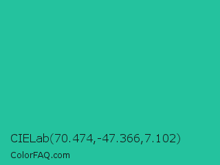 CIELab 70.474,-47.366,7.102 Color is a normal cyan color and the nearest color is Shamrock #33cc99. Hex code #24c29e and RGB value is rgb(36,194,158). In RGB color space, this color is composed of 14% red, 76% green, 62% blue, In CMYK color space, this color is composed of 81% cyan, 0% magenta, 19% yellow , 24% black , In HSL color space, this color has a hue angle of 166° , 69% saturation and 45% lightness.