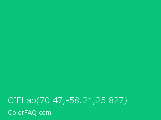 CIELab 70.47,-58.21,25.827 Color is a normal green color and the nearest color is Mountain Meadow Crayola #1ab385. Hex code #09c57b and RGB value is rgb(9,197,123). In RGB color space, this color is composed of 4% red, 77% green, 48% blue, In CMYK color space, this color is composed of 95% cyan, 0% magenta, 38% yellow , 23% black , In HSL color space, this color has a hue angle of 156° , 91% saturation and 40% lightness.