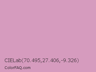 CIELab 70.495,27.406,-9.326 Color is a light magenta color and the nearest color is Light Medium Orchid #d39bcb. Hex code #d69bbe and RGB value is rgb(214,155,190). In RGB color space, this color is composed of 84% red, 61% green, 75% blue, In CMYK color space, this color is composed of 0% cyan, 28% magenta, 11% yellow , 16% black , In HSL color space, this color has a hue angle of 324° , 42% saturation and 72% lightness.