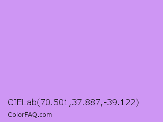 CIELab 70.501,37.887,-39.122 Color is a light purple color and the nearest color is Pale Violet #cc99ff. Hex code #ce96f4 and RGB value is rgb(206,150,244). In RGB color space, this color is composed of 81% red, 59% green, 96% blue, In CMYK color space, this color is composed of 16% cyan, 39% magenta, 0% yellow , 4% black , In HSL color space, this color has a hue angle of 276° , 81% saturation and 77% lightness.