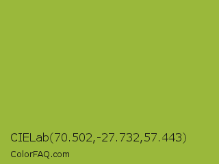 CIELab 70.502,-27.732,57.443 Color is a normal lime color and the nearest color is Android Green #a4c639. Hex code #9ab83b and RGB value is rgb(154,184,59). In RGB color space, this color is composed of 60% red, 72% green, 23% blue, In CMYK color space, this color is composed of 16% cyan, 0% magenta, 68% yellow , 28% black , In HSL color space, this color has a hue angle of 74° , 51% saturation and 48% lightness.