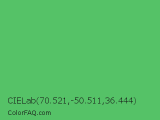 CIELab 70.521,-50.511,36.444 Color is a normal green color and the nearest color is Fern #63b76c. Hex code #55c267 and RGB value is rgb(85,194,103). In RGB color space, this color is composed of 33% red, 76% green, 40% blue, In CMYK color space, this color is composed of 56% cyan, 0% magenta, 47% yellow , 24% black , In HSL color space, this color has a hue angle of 130° , 47% saturation and 55% lightness.