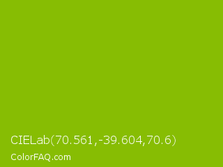 CIELab 70.561,-39.604,70.6 Color is a normal lime color and the nearest color is Apple Green #8db600. Hex code #87bd03 and RGB value is rgb(135,189,3). In RGB color space, this color is composed of 53% red, 74% green, 1% blue, In CMYK color space, this color is composed of 29% cyan, 0% magenta, 98% yellow , 26% black , In HSL color space, this color has a hue angle of 77° , 97% saturation and 38% lightness.