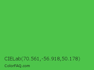 CIELab 70.561,-56.918,50.178 Color is a normal green color and the nearest color is Apple #4fa83d. Hex code #4dc44a and RGB value is rgb(77,196,74). In RGB color space, this color is composed of 30% red, 77% green, 29% blue, In CMYK color space, this color is composed of 61% cyan, 0% magenta, 62% yellow , 23% black , In HSL color space, this color has a hue angle of 119° , 51% saturation and 53% lightness.