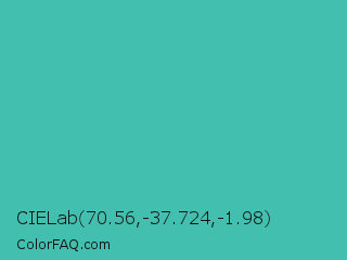 CIELab 70.56,-37.724,-1.98 Color is a normal cyan color and the nearest color is Puerto Rico #3fc1aa. Hex code #43bfaf and RGB value is rgb(67,191,175). In RGB color space, this color is composed of 26% red, 75% green, 69% blue, In CMYK color space, this color is composed of 65% cyan, 0% magenta, 8% yellow , 25% black , In HSL color space, this color has a hue angle of 172° , 49% saturation and 51% lightness.