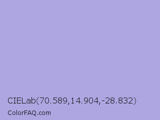 CIELab 70.589,14.904,-28.832 Color is a light indigo color and the nearest color is Maximum Blue Purple #acace6. Hex code #ada6e1 and RGB value is rgb(173,166,225). In RGB color space, this color is composed of 68% red, 65% green, 88% blue, In CMYK color space, this color is composed of 23% cyan, 26% magenta, 0% yellow , 12% black , In HSL color space, this color has a hue angle of 247° , 50% saturation and 77% lightness.