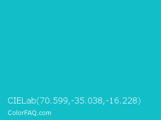 CIELab 70.599,-35.038,-16.228 Color is a normal cyan color and the nearest color is Java #1fc2c2. Hex code #12bfc9 and RGB value is rgb(18,191,201). In RGB color space, this color is composed of 7% red, 75% green, 79% blue, In CMYK color space, this color is composed of 91% cyan, 5% magenta, 0% yellow , 21% black , In HSL color space, this color has a hue angle of 183° , 84% saturation and 43% lightness.