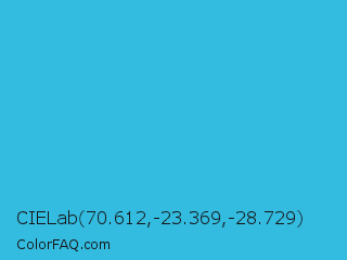 CIELab 70.612,-23.369,-28.729 Color is a normal cyan color and the nearest color is Scooter #2ebfd4. Hex code #33bbe0 and RGB value is rgb(51,187,224). In RGB color space, this color is composed of 20% red, 73% green, 88% blue, In CMYK color space, this color is composed of 77% cyan, 17% magenta, 0% yellow , 12% black , In HSL color space, this color has a hue angle of 193° , 74% saturation and 54% lightness.