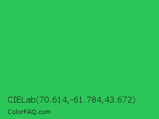 CIELab 70.614,-61.784,43.672 Color is a normal green color and the nearest color is UFO Green #3cd070. Hex code #2cc658 and RGB value is rgb(44,198,88). In RGB color space, this color is composed of 17% red, 78% green, 35% blue, In CMYK color space, this color is composed of 78% cyan, 0% magenta, 56% yellow , 22% black , In HSL color space, this color has a hue angle of 137° , 64% saturation and 47% lightness.