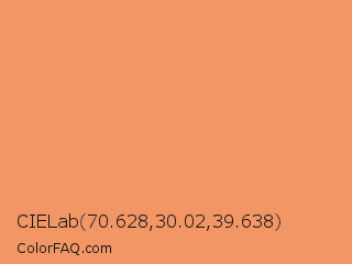 CIELab 70.628,30.02,39.638 Color is a light orange color and the nearest color is Atomic Tangerine #ff9966. Hex code #f29666 and RGB value is rgb(242,150,102). In RGB color space, this color is composed of 95% red, 59% green, 40% blue, In CMYK color space, this color is composed of 0% cyan, 38% magenta, 58% yellow , 5% black , In HSL color space, this color has a hue angle of 21° , 84% saturation and 67% lightness.
