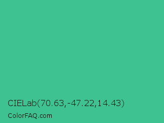 CIELab 70.63,-47.22,14.43 Color is a normal green color and the nearest color is Ocean Green #48bf91. Hex code #3ec291 and RGB value is rgb(62,194,145). In RGB color space, this color is composed of 24% red, 76% green, 57% blue, In CMYK color space, this color is composed of 68% cyan, 0% magenta, 25% yellow , 24% black , In HSL color space, this color has a hue angle of 158° , 52% saturation and 50% lightness.