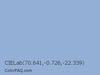 CIELab 70.641,-0.726,-22.339 Color is a light blue color and the nearest color is Polo Blue #8da8cc. Hex code #93afd5 and RGB value is rgb(147,175,213). In RGB color space, this color is composed of 58% red, 69% green, 84% blue, In CMYK color space, this color is composed of 31% cyan, 18% magenta, 0% yellow , 16% black , In HSL color space, this color has a hue angle of 215° , 44% saturation and 71% lightness.