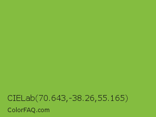 CIELab 70.643,-38.26,55.165 Color is a normal green color and the nearest color is Sushi #87ab39. Hex code #84bd40 and RGB value is rgb(132,189,64). In RGB color space, this color is composed of 52% red, 74% green, 25% blue, In CMYK color space, this color is composed of 30% cyan, 0% magenta, 66% yellow , 26% black , In HSL color space, this color has a hue angle of 87° , 49% saturation and 50% lightness.