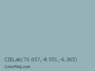 CIELab 70.657,-8.551,-6.365 Color is a light cyan color and the nearest color is Gull Gray #9dacb7. Hex code #95b2b8 and RGB value is rgb(149,178,184). In RGB color space, this color is composed of 58% red, 70% green, 72% blue, In CMYK color space, this color is composed of 19% cyan, 3% magenta, 0% yellow , 28% black , In HSL color space, this color has a hue angle of 190° , 20% saturation and 65% lightness.