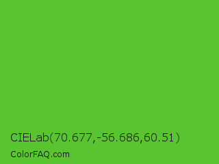 CIELab 70.677,-56.686,60.51 Color is a normal green color and the nearest color is Green RYB #66b032. Hex code #57c430 and RGB value is rgb(87,196,48). In RGB color space, this color is composed of 34% red, 77% green, 19% blue, In CMYK color space, this color is composed of 56% cyan, 0% magenta, 76% yellow , 23% black , In HSL color space, this color has a hue angle of 104° , 61% saturation and 48% lightness.