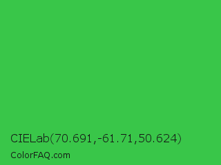 CIELab 70.691,-61.71,50.624 Color is a normal green color and the nearest color is Lime Green #32cd32. Hex code #39c649 and RGB value is rgb(57,198,73). In RGB color space, this color is composed of 22% red, 78% green, 29% blue, In CMYK color space, this color is composed of 71% cyan, 0% magenta, 63% yellow , 22% black , In HSL color space, this color has a hue angle of 127° , 55% saturation and 50% lightness.