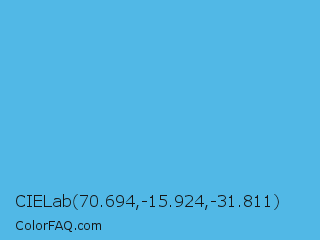 CIELab 70.694,-15.924,-31.811 Color is a light blue color and the nearest color is Picton Blue #45b1e8. Hex code #51b8e6 and RGB value is rgb(81,184,230). In RGB color space, this color is composed of 32% red, 72% green, 90% blue, In CMYK color space, this color is composed of 65% cyan, 20% magenta, 0% yellow , 10% black , In HSL color space, this color has a hue angle of 199° , 75% saturation and 61% lightness.