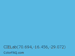CIELab 70.694,-16.456,-29.072 Color is a light blue color and the nearest color is Blue Jeans #5dadec. Hex code #57b8e1 and RGB value is rgb(87,184,225). In RGB color space, this color is composed of 34% red, 72% green, 88% blue, In CMYK color space, this color is composed of 61% cyan, 18% magenta, 0% yellow , 12% black , In HSL color space, this color has a hue angle of 198° , 70% saturation and 61% lightness.