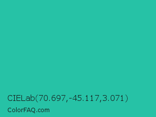 CIELab 70.697,-45.117,3.071 Color is a normal cyan color and the nearest color is Light Sea Green #20b2aa. Hex code #26c2a6 and RGB value is rgb(38,194,166). In RGB color space, this color is composed of 15% red, 76% green, 65% blue, In CMYK color space, this color is composed of 80% cyan, 0% magenta, 14% yellow , 24% black , In HSL color space, this color has a hue angle of 169° , 67% saturation and 45% lightness.