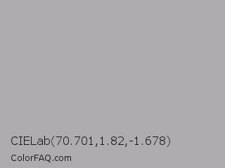 CIELab 70.701,1.82,-1.678 Color is a light purple color and the nearest color is Silver Chalice #acacac. Hex code #afacb0 and RGB value is rgb(175,172,176). In RGB color space, this color is composed of 69% red, 67% green, 69% blue, In CMYK color space, this color is composed of 1% cyan, 2% magenta, 0% yellow , 31% black , In HSL color space, this color has a hue angle of 285° , 2% saturation and 68% lightness.