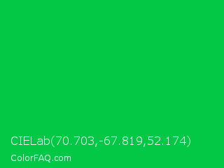 CIELab 70.703,-67.819,52.174 Color is a normal green color and the nearest color is Dark Pastel Green #03c03c. Hex code #03c845 and RGB value is rgb(3,200,69). In RGB color space, this color is composed of 1% red, 78% green, 27% blue, In CMYK color space, this color is composed of 99% cyan, 0% magenta, 66% yellow , 22% black , In HSL color space, this color has a hue angle of 140° , 97% saturation and 40% lightness.