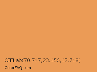 CIELab 70.717,23.456,47.718 Color is a light orange color and the nearest color is Big Foot Feet #e88e5a. Hex code #eb9b56 and RGB value is rgb(235,155,86). In RGB color space, this color is composed of 92% red, 61% green, 34% blue, In CMYK color space, this color is composed of 0% cyan, 34% magenta, 63% yellow , 8% black , In HSL color space, this color has a hue angle of 28° , 79% saturation and 63% lightness.