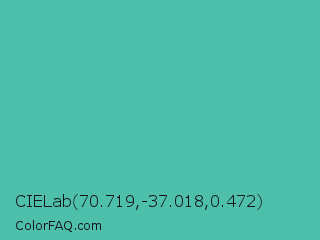 CIELab 70.719,-37.018,0.472 Color is a normal cyan color and the nearest color is Puerto Rico #3fc1aa. Hex code #4dbfab and RGB value is rgb(77,191,171). In RGB color space, this color is composed of 30% red, 75% green, 67% blue, In CMYK color space, this color is composed of 60% cyan, 0% magenta, 10% yellow , 25% black , In HSL color space, this color has a hue angle of 169° , 47% saturation and 53% lightness.