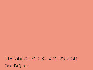 CIELab 70.719,32.471,25.204 Color is a light red color and the nearest color is Dark Salmon #e9967a. Hex code #f19581 and RGB value is rgb(241,149,129). In RGB color space, this color is composed of 95% red, 58% green, 51% blue, In CMYK color space, this color is composed of 0% cyan, 38% magenta, 46% yellow , 5% black , In HSL color space, this color has a hue angle of 11° , 80% saturation and 73% lightness.