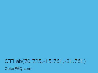CIELab 70.725,-15.761,-31.761 Color is a light blue color and the nearest color is Picton Blue #45b1e8. Hex code #52b8e6 and RGB value is rgb(82,184,230). In RGB color space, this color is composed of 32% red, 72% green, 90% blue, In CMYK color space, this color is composed of 64% cyan, 20% magenta, 0% yellow , 10% black , In HSL color space, this color has a hue angle of 199° , 75% saturation and 61% lightness.