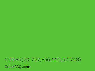 CIELab 70.727,-56.116,57.748 Color is a normal green color and the nearest color is Green RYB #66b032. Hex code #57c438 and RGB value is rgb(87,196,56). In RGB color space, this color is composed of 34% red, 77% green, 22% blue, In CMYK color space, this color is composed of 56% cyan, 0% magenta, 71% yellow , 23% black , In HSL color space, this color has a hue angle of 107° , 56% saturation and 49% lightness.