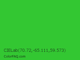 CIELab 70.72,-65.111,59.573 Color is a normal green color and the nearest color is Lime Green #32cd32. Hex code #33c732 and RGB value is rgb(51,199,50). In RGB color space, this color is composed of 20% red, 78% green, 20% blue, In CMYK color space, this color is composed of 74% cyan, 0% magenta, 75% yellow , 22% black , In HSL color space, this color has a hue angle of 120° , 60% saturation and 49% lightness.