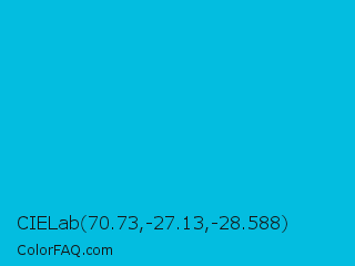 CIELab 70.73,-27.13,-28.588 Color is a normal cyan color and the nearest color is Cyan Process #00b7eb. Hex code #03bde0 and RGB value is rgb(3,189,224). In RGB color space, this color is composed of 1% red, 74% green, 88% blue, In CMYK color space, this color is composed of 99% cyan, 16% magenta, 0% yellow , 12% black , In HSL color space, this color has a hue angle of 190° , 97% saturation and 45% lightness.