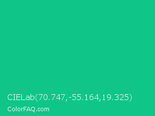 CIELab 70.747,-55.164,19.325 Color is a normal green color and the nearest color is Mountain Meadow Crayola #1ab385. Hex code #10c588 and RGB value is rgb(16,197,136). In RGB color space, this color is composed of 6% red, 77% green, 53% blue, In CMYK color space, this color is composed of 92% cyan, 0% magenta, 31% yellow , 23% black , In HSL color space, this color has a hue angle of 160° , 85% saturation and 42% lightness.