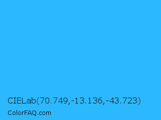 CIELab 70.749,-13.136,-43.723 Color is a normal blue color and the nearest color is Spiro Disco Ball #0fc0fc. Hex code #2bb8fc and RGB value is rgb(43,184,252). In RGB color space, this color is composed of 17% red, 72% green, 99% blue, In CMYK color space, this color is composed of 83% cyan, 27% magenta, 0% yellow , 1% black , In HSL color space, this color has a hue angle of 200° , 97% saturation and 58% lightness.