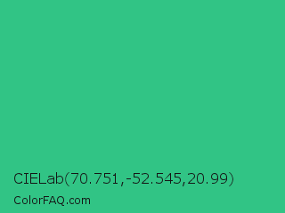 CIELab 70.751,-52.545,20.99 Color is a normal green color and the nearest color is Mountain Meadow #30ba8f. Hex code #31c485 and RGB value is rgb(49,196,133). In RGB color space, this color is composed of 19% red, 77% green, 52% blue, In CMYK color space, this color is composed of 75% cyan, 0% magenta, 32% yellow , 23% black , In HSL color space, this color has a hue angle of 154° , 60% saturation and 48% lightness.