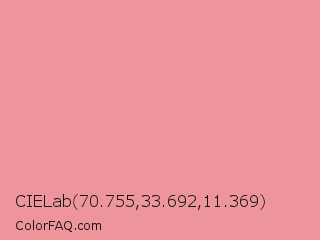 CIELab 70.755,33.692,11.369 Color is a light red color and the nearest color is Sea Pink #ed989e. Hex code #ed959a and RGB value is rgb(237,149,154). In RGB color space, this color is composed of 93% red, 58% green, 60% blue, In CMYK color space, this color is composed of 0% cyan, 37% magenta, 35% yellow , 7% black , In HSL color space, this color has a hue angle of 357° , 71% saturation and 76% lightness.