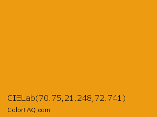 CIELab 70.75,21.248,72.741 Color is a normal orange color and the nearest color is Gamboge #e49b0f. Hex code #ed9c12 and RGB value is rgb(237,156,18). In RGB color space, this color is composed of 93% red, 61% green, 7% blue, In CMYK color space, this color is composed of 0% cyan, 34% magenta, 92% yellow , 7% black , In HSL color space, this color has a hue angle of 38° , 86% saturation and 50% lightness.