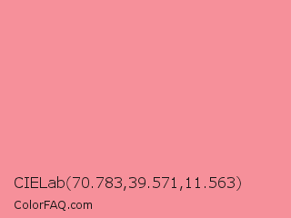 CIELab 70.783,39.571,11.563 Color is a light red color and the nearest color is Sea Pink #ed989e. Hex code #f6909a and RGB value is rgb(246,144,154). In RGB color space, this color is composed of 96% red, 56% green, 60% blue, In CMYK color space, this color is composed of 0% cyan, 41% magenta, 37% yellow , 4% black , In HSL color space, this color has a hue angle of 354° , 85% saturation and 76% lightness.