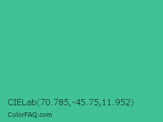 CIELab 70.785,-45.75,11.952 Color is a normal green color and the nearest color is Ocean Green #48bf91. Hex code #40c296 and RGB value is rgb(64,194,150). In RGB color space, this color is composed of 25% red, 76% green, 59% blue, In CMYK color space, this color is composed of 67% cyan, 0% magenta, 23% yellow , 24% black , In HSL color space, this color has a hue angle of 160° , 52% saturation and 51% lightness.