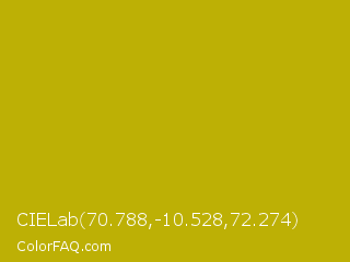 CIELab 70.788,-10.528,72.274 Color is a normal yellow color and the nearest color is Buddha Gold #c1a004. Hex code #bdb005 and RGB value is rgb(189,176,5). In RGB color space, this color is composed of 74% red, 69% green, 2% blue, In CMYK color space, this color is composed of 0% cyan, 7% magenta, 97% yellow , 26% black , In HSL color space, this color has a hue angle of 56° , 95% saturation and 38% lightness.