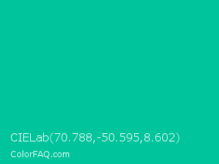 CIELab 70.788,-50.595,8.602 Color is a normal cyan color and the nearest color is Caribbean Green #00cc99. Hex code #00c49c and RGB value is rgb(0,196,156). In RGB color space, this color is composed of 0% red, 77% green, 61% blue, In CMYK color space, this color is composed of 100% cyan, 0% magenta, 20% yellow , 23% black , In HSL color space, this color has a hue angle of 168° , 100% saturation and 38% lightness.