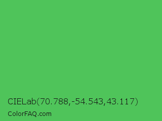 CIELab 70.788,-54.543,43.117 Color is a normal green color and the nearest color is Fern #63b76c. Hex code #4fc45a and RGB value is rgb(79,196,90). In RGB color space, this color is composed of 31% red, 77% green, 35% blue, In CMYK color space, this color is composed of 60% cyan, 0% magenta, 54% yellow , 23% black , In HSL color space, this color has a hue angle of 126° , 50% saturation and 54% lightness.