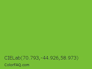 CIELab 70.793,-44.926,58.973 Color is a normal green color and the nearest color is Green RYB #66b032. Hex code #77c036 and RGB value is rgb(119,192,54). In RGB color space, this color is composed of 47% red, 75% green, 21% blue, In CMYK color space, this color is composed of 38% cyan, 0% magenta, 72% yellow , 25% black , In HSL color space, this color has a hue angle of 92° , 56% saturation and 48% lightness.