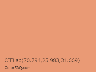 CIELab 70.794,25.983,31.669 Color is a light orange color and the nearest color is Dark Salmon #e9967a. Hex code #ea9a75 and RGB value is rgb(234,154,117). In RGB color space, this color is composed of 92% red, 60% green, 46% blue, In CMYK color space, this color is composed of 0% cyan, 34% magenta, 50% yellow , 8% black , In HSL color space, this color has a hue angle of 19° , 74% saturation and 69% lightness.